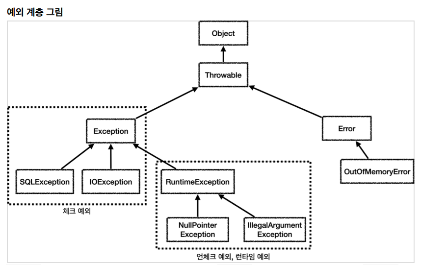 - Exception 과 그 하위 예외는 모두 컴파일러가 체크하는 체크 예외이다. 단 RuntimeException 은 예외로 한다