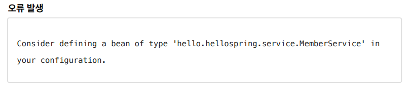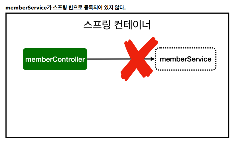 하지만 이렇게 하면 오류가 발생하는데, 스프링 컨테이너에 memberService가 빈으로 등록되어있지 않기 때문이다.