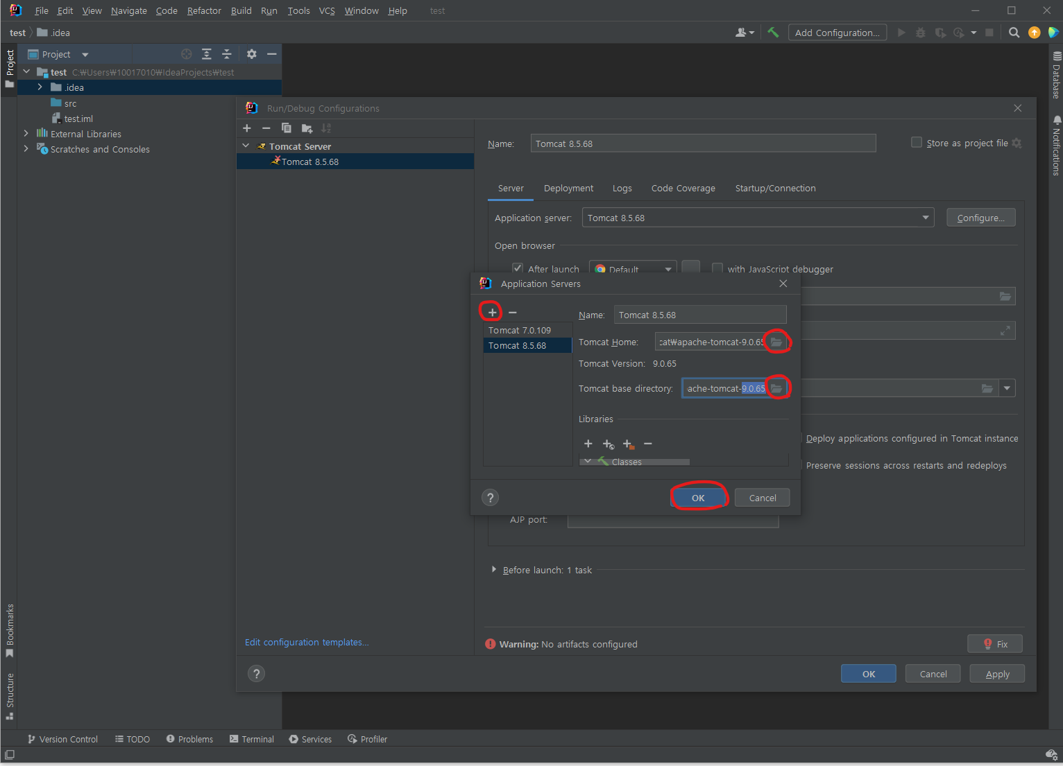 + 누르고 1번에서 로컬에 다운받은 톰캣 폴더의 주소를 넣는다