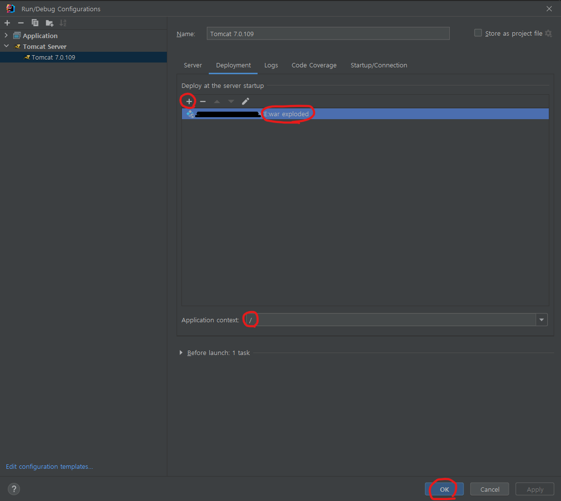+를 누르고 톰캣 서버에 올릴 .war exploded 파일을 추가한다. 그다음 Application context를 / 로 설정