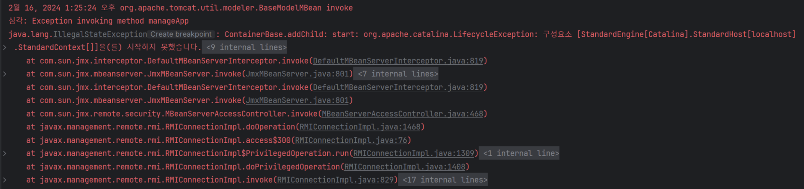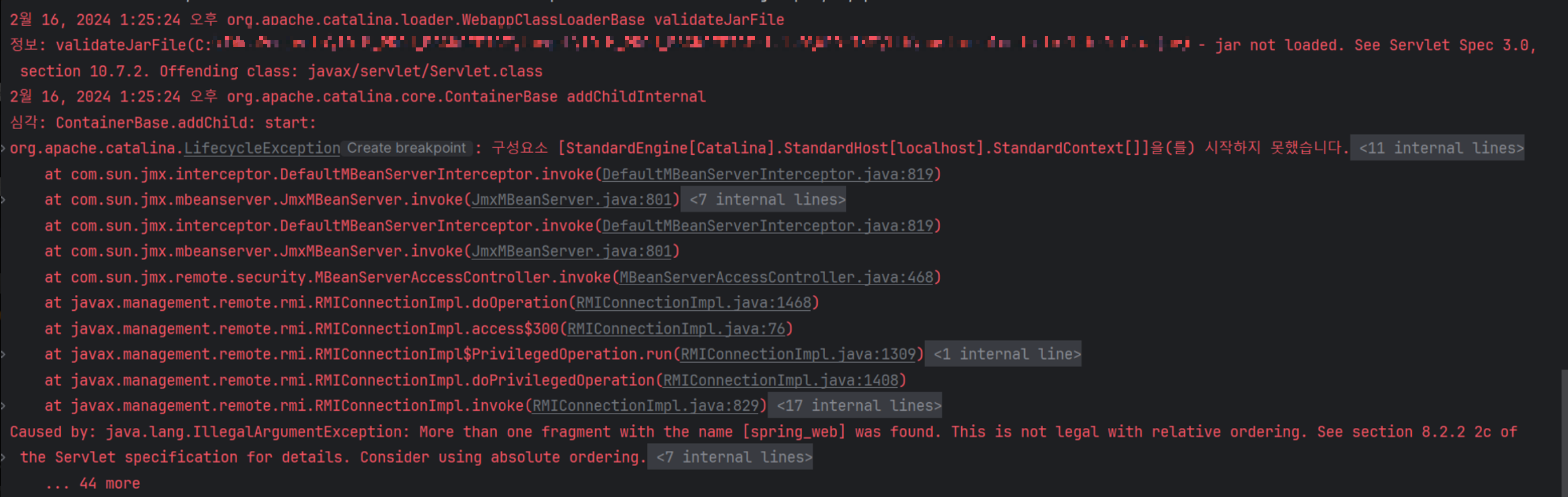 심각: ContainerBase.addChild: start: org.apache.catalina.LifecycleException: 구성요소 [StandardEngine[Catalina].StandardHost[localhost].StandardContext[]]을(를) 시작하지 못했습니다. at org.apache.catalina.util.LifecycleBase.handleSubClassException(LifecycleBase.java:440) at org.apache.catalina.util.LifecycleBase.start(LifecycleBase.java:198) at org.apache.catalina.core.ContainerBase.addChildInternal(ContainerBase.java:1007) at org.apache.catalina.core.ContainerBase.addChild(ContainerBase.java:983) at org.apache.catalina.core.StandardHost.addChild(StandardHost.java:639) at org.apache.catalina.startup.HostConfig.manageApp(HostConfig.java:1899) at sun.reflect.NativeMethodAccessorImpl.invoke0(Native Method) at sun.reflect.NativeMethodAccessorImpl.invoke(NativeMethodAccessorImpl.java:62) at sun.reflect.DelegatingMethodAccessorImpl.invoke(DelegatingMethodAccessorImpl.java:43) at java.lang.reflect.Method.invoke(Method.java:498) at org.apache.tomcat.util.modeler.BaseModelMBean.invoke(BaseModelMBean.java:302) at com.sun.jmx.interceptor.DefaultMBeanServerInterceptor.invoke(DefaultMBeanServerInterceptor.java:819) at com.sun.jmx.mbeanserver.JmxMBeanServer.invoke(JmxMBeanServer.java:801) at org.apache.catalina.mbeans.MBeanFactory.createStandardContext(MBeanFactory.java:636) at org.apache.catalina.mbeans.MBeanFactory.createStandardContext(MBeanFactory.java:580) at sun.reflect.NativeMethodAccessorImpl.invoke0(Native Method) at sun.reflect.NativeMethodAccessorImpl.invoke(NativeMethodAccessorImpl.java:62) at sun.reflect.DelegatingMethodAccessorImpl.invoke(DelegatingMethodAccessorImpl.java:43) at java.lang.reflect.Method.invoke(Method.java:498) at org.apache.tomcat.util.modeler.BaseModelMBean.invoke(BaseModelMBean.java:302) at com.sun.jmx.interceptor.DefaultMBeanServerInterceptor.invoke(DefaultMBeanServerInterceptor.java:819) at com.sun.jmx.mbeanserver.JmxMBeanServer.invoke(JmxMBeanServer.java:801) at com.sun.jmx.remote.security.MBeanServerAccessController.invoke(MBeanServerAccessController.java:468) at