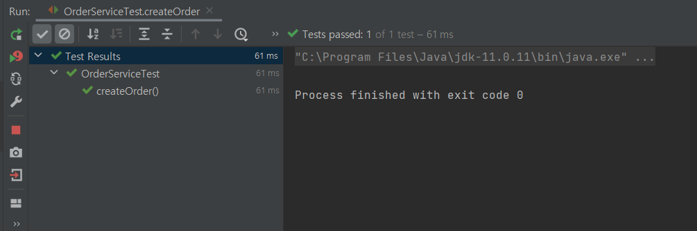 다음은 Junit으로 넘어와 order 패키지를 생성하고 OrderServiceTest 클래스를 생성하여 테스트한다.