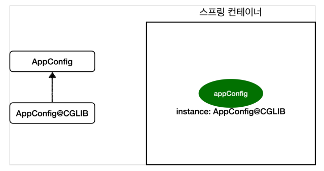 그런데 예상과는 다르게 클래스 명에 xxxCGLIB가 붙으면서 상당히 복잡해진 것을 볼 수 있다. 이것은 내가 만든 클래스가 아니라 스프링이 CGLIB라는 바이트코드 조작 라이브러리를 사용해서 AppConfig 클래스를 상속받은 임의의 다른 클래스를 만들고, 그 다른 클래스를 스프링 빈으로 등록한 것이다!