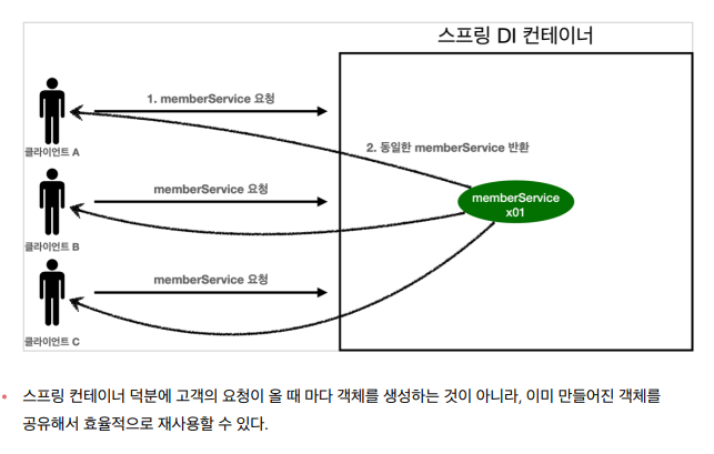 스프링 컨테이너는 싱글톤 패턴의 문제점을 해결하면서, 객체 인스턴스를 싱글톤(1개만 생성)으로 관리한다.