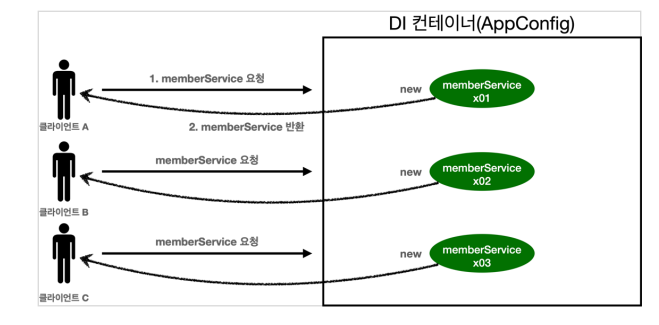 우리가 만들었던 스프링 없는 순수한 DI 컨테이너인 AppConfig는 요청을 할 때 마다 객체를 새로 생성한다.