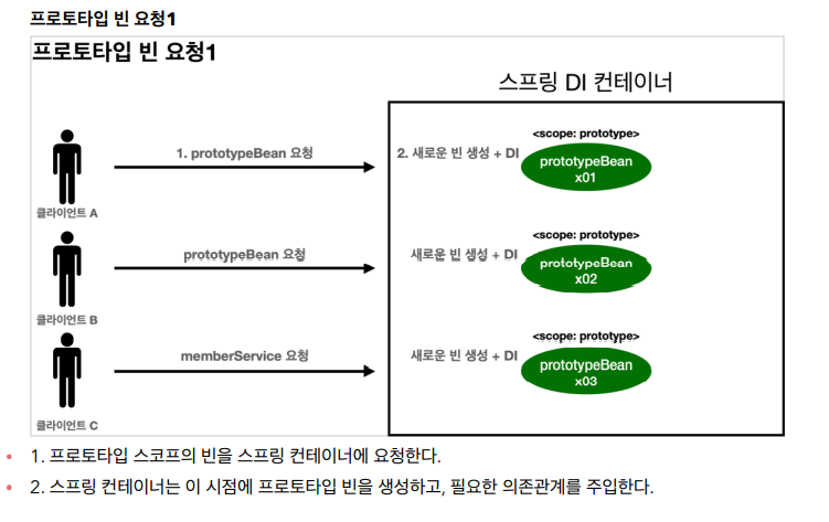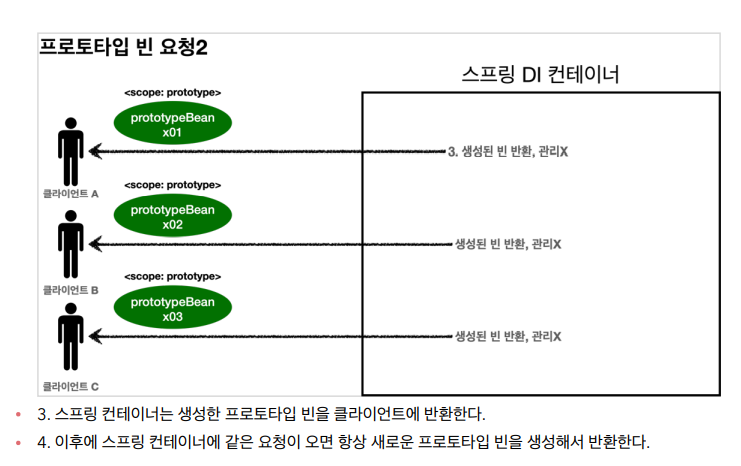 클라이언트에 빈을 반환하고, 이후 스프링 컨테이너는 생성된 프로토타입 빈을 관리하지 않는다.