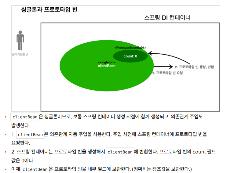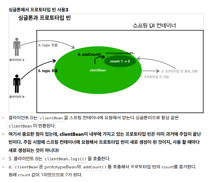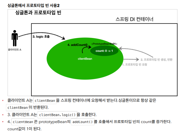 스프링은 일반적으로 싱글톤 빈을 사용하므로, 싱글톤 빈이 프로토타입 빈을 사용하게 된다.