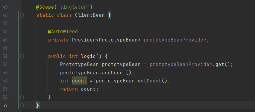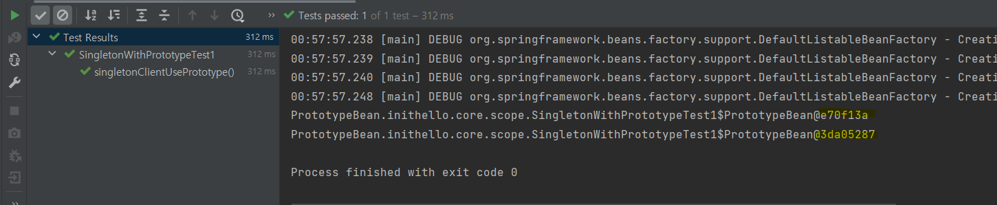 실행해보면 provider.get() 을 통해서 항상 새로운 프로토타입 빈이 생성되는 것을 확인할 수 있다.