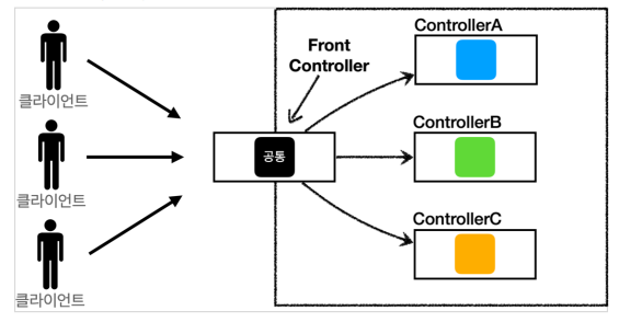- 프론트 컨트롤러 서블릿 하나로 클라이언트의 요청을 받음
