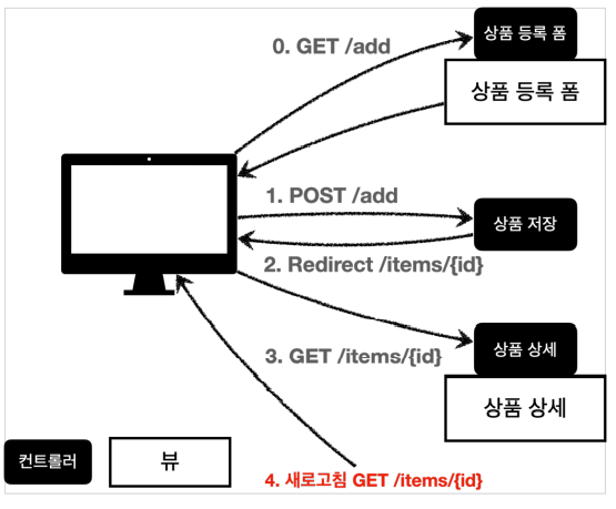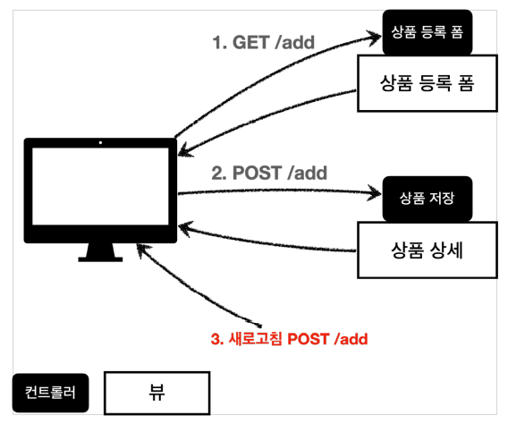 새로 고침 문제를 해결하려면 상품 저장 후에 뷰 템플릿으로 이동하는 것이 아니라, 상품 상세 화면으로 리다이렉트를 호출해주면 된다.