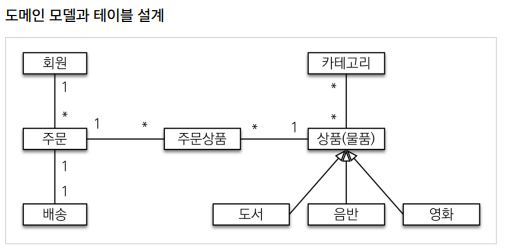 관계형 데이터베이스는 다대다 관계 지원이 안되므로 CATEGORY와 ITEM의 다대다 관계를 중간에 CARTEGORY_ITEM을 놓고 다대일, 다대일 관계로 풀어야 한다.