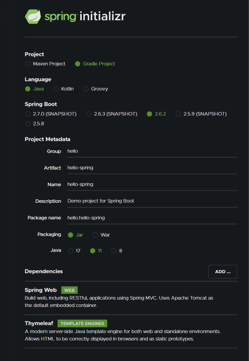 Dependencies가 중요한데 Spring Web이랑 html 파일을 생성해주는 Thymeleaf를 ADD 한다.