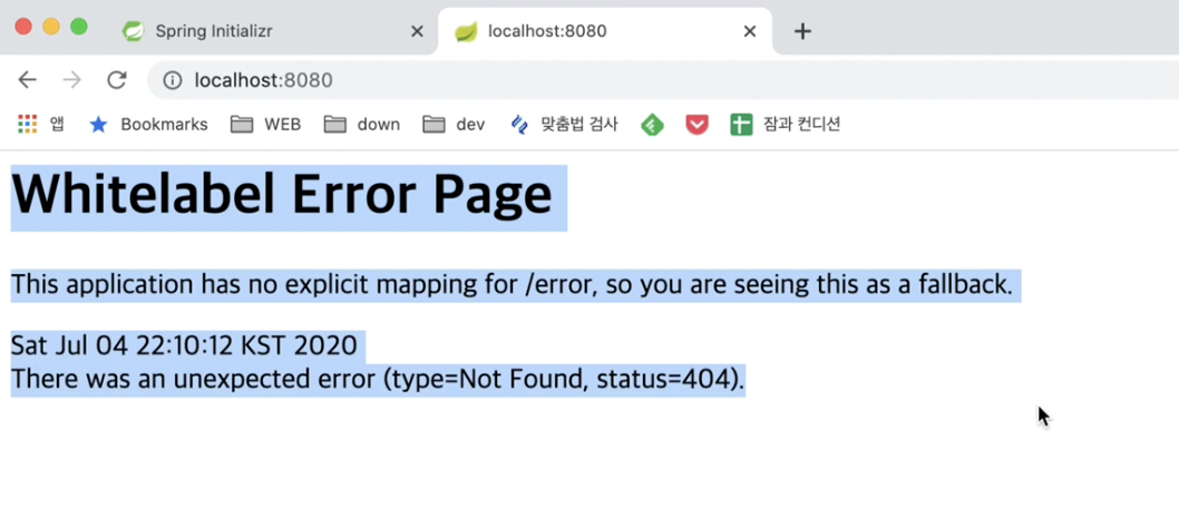 그 후 웹페이지에 localhost:8080에 들어가서 이러한 Error Page가 나온다면 성공이다.