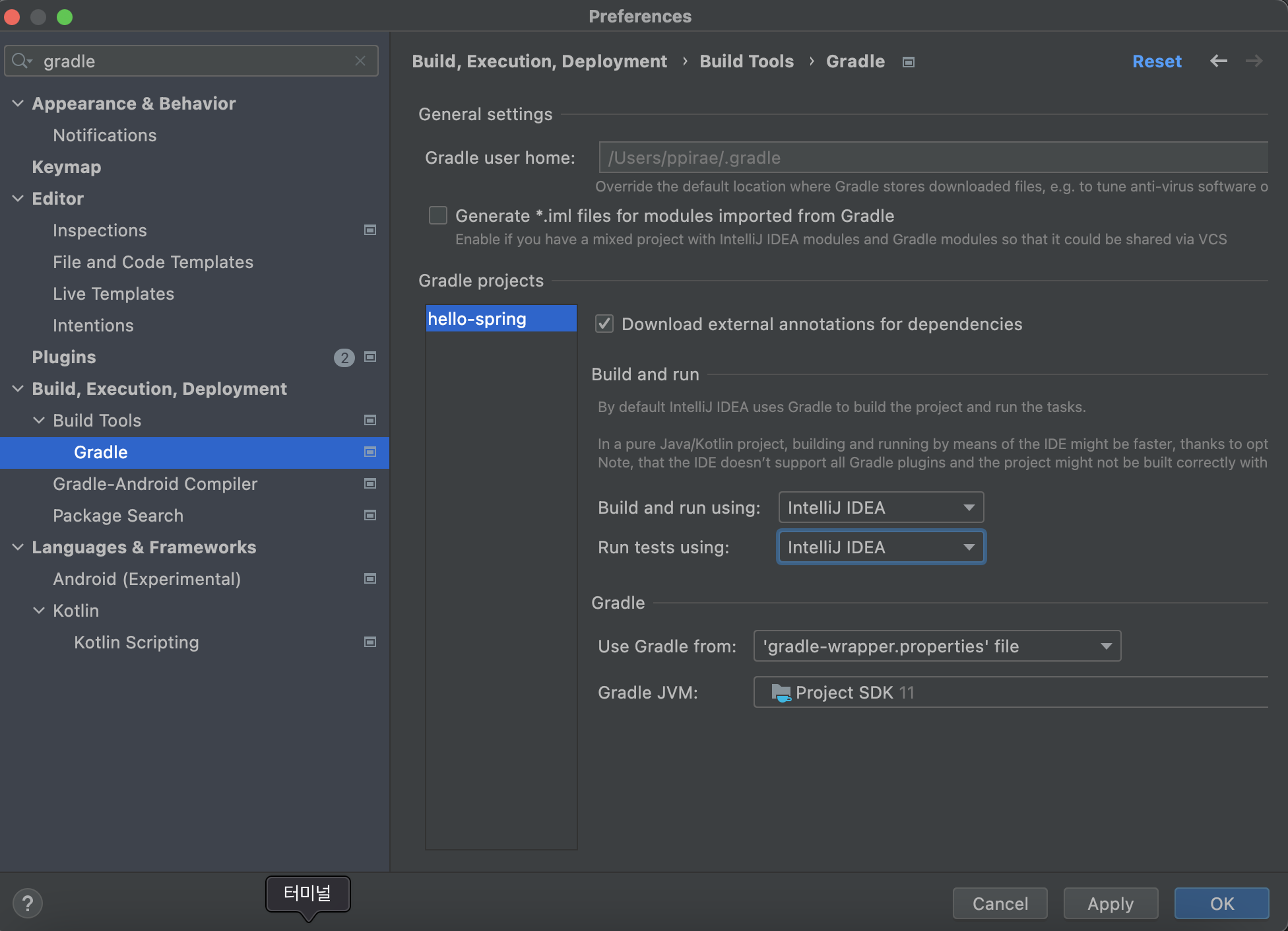 intelliJ Preference - Gradle검색 후 Build and Run using 부분과 Run tests using 부분을 모두
